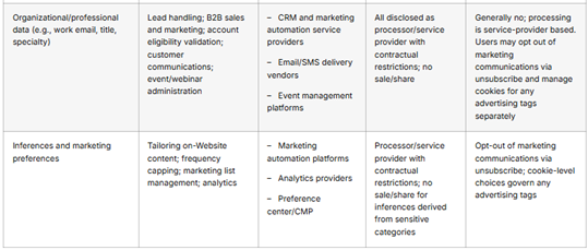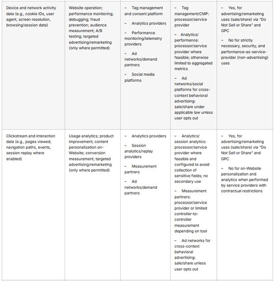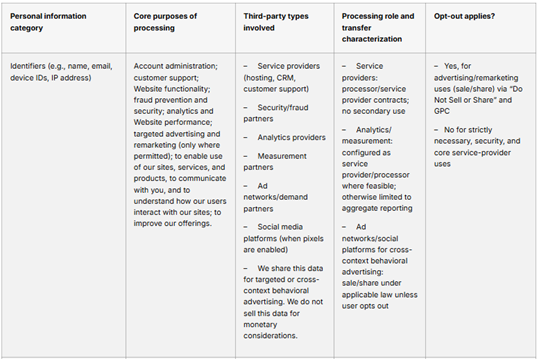 We collect and disclose personal information as described in the matrix above and also as set out in this privacy notice. Where we engage service providers or processors, we contractually restrict their use of personal information to our documented instructions and prohibit secondary use and disclosure. Where our use of advertising technologies may constitute a “sale” or “share” of personal information under applicable law, we honor your right to opt out. You may exercise your “Do Not Sell or Share My Personal Information” choice at any time via our consent management platform, and we also process Global Privacy Control (GPC) signals in a frictionless manner. When you opt out or when a GPC signal is detected, we prevent the firing of advertising/remarketing tags and the disclosure of data to ad networks and social media platforms for cross-context behavioral advertising. Strictly necessary and security-related processing may continue to ensure the Website functions properly.